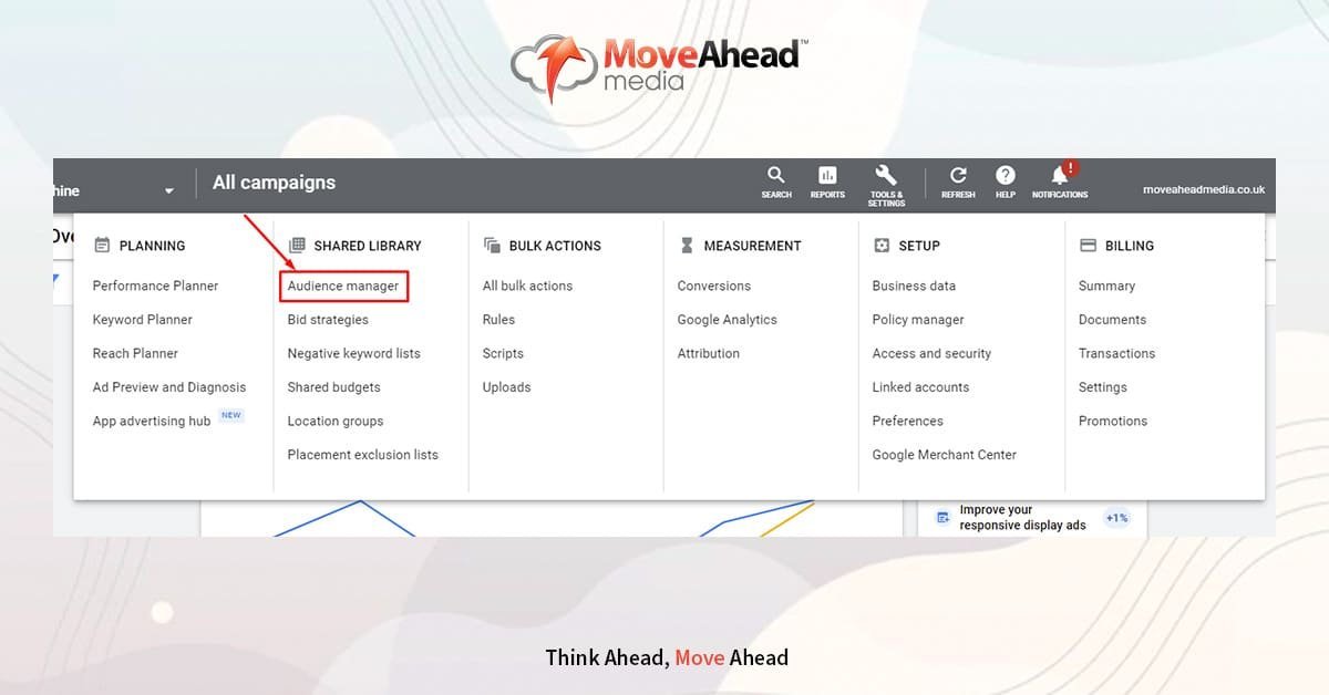 To create lists in Google Ads, navigate to the Tools & Settings menu where you’ll find a list of settings and options. In this section, click on Audience Manager. This will show the main List Area.